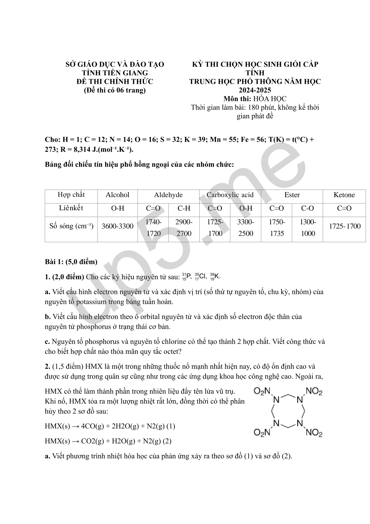 | SỞ GIÁO DỤC VÀ ĐÀO TẠOTỈNH TIỀN GIANGĐỀ THI CHÍNH THỨC(Đề thi có 06 trang) | KỲ THI CHỌN HỌC SINH GIỎI CẤP TỈNHTRUNG HỌC PHỔ THÔNG NĂM HỌC 2024-2025Môn thi: HÓA HỌCThời gian làm bài: 180 phút, không kể thời gian phát đề |