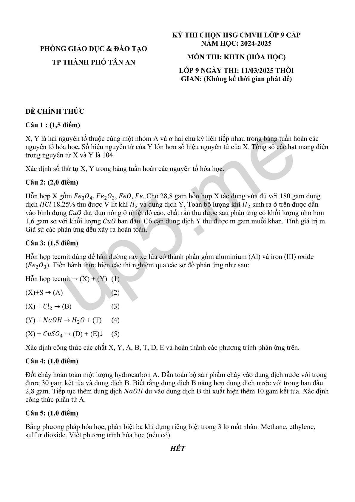 | PHÒNG GIÁO DỤC & ĐÀO TẠOTP THÀNH PHÓ TÂN AN | KỲ THI CHỌN HSG CMVH LỚP 9 CẤP NĂM HỌC: 2024-2025 MÔN THI: KHTN (HÓA HỌC) LỚP 9 NGÀY THI: 11/03/2025 THỜI GIAN: (Không kể thời gian phát đề) |