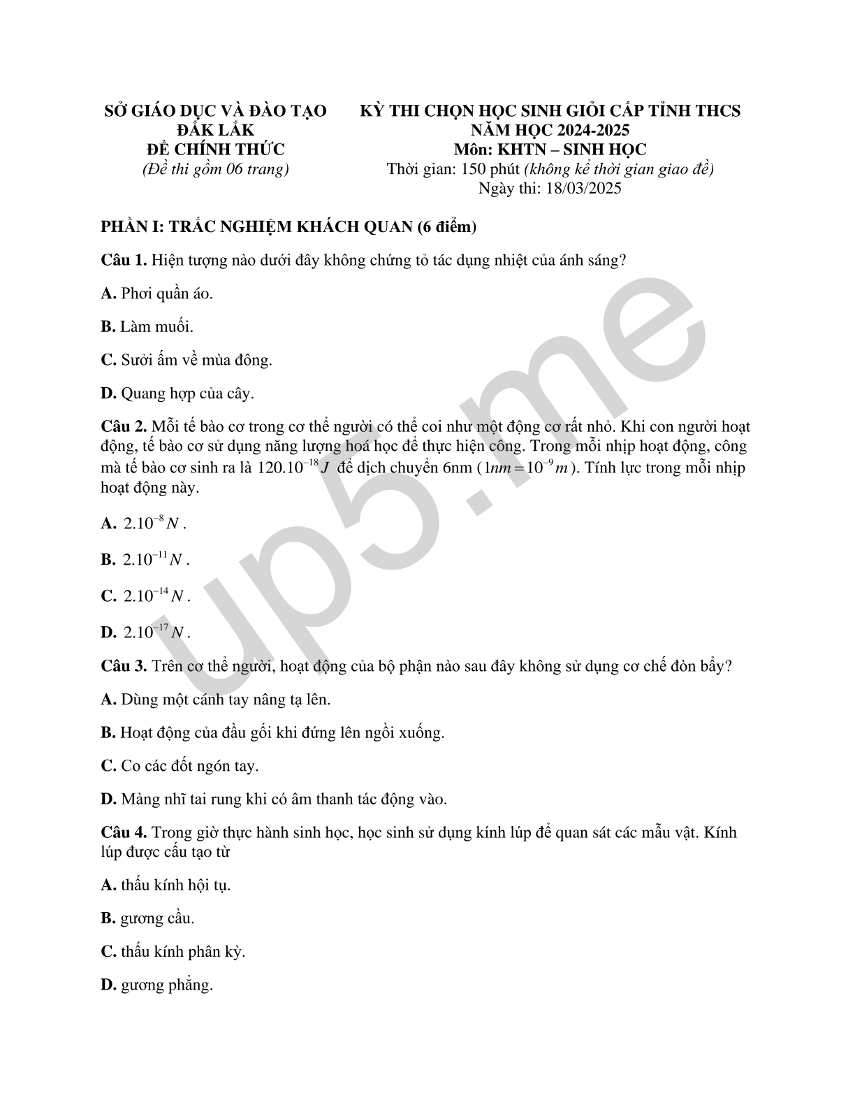 | SỞ GIÁO DỤC VÀ ĐÀO TẠOĐẮK LẮKĐỀ CHÍNH THỨC(Đề thi gồm 06 trang) | KỲ THI CHỌN HỌC SINH GIỎI CẤP TỈNH THCSNĂM HỌC 2024-2025Môn: KHTN – SINH HỌC Thời gian: 150 phút (không kể thời gian giao đề) Ngày thi: 18/03/2025 |