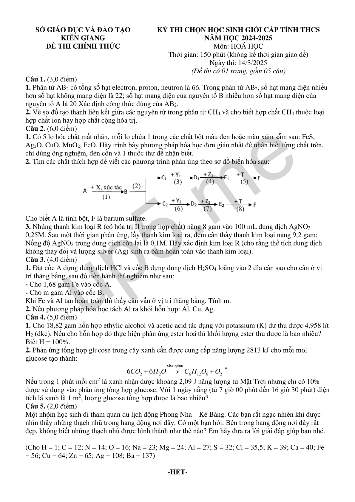 | SỞ GIÁO DỤC VÀ ĐÀO TẠOKIÊN GIANGĐỀ THI CHÍNH THỨC | KỲ THI CHỌN HỌC SINH GIỎI CẤP TỈNH THCSNĂM HỌC 2024-2025Môn: HOÁ HỌCThời gian: 150 phút (không kể thời gian giao đề)Ngày thi: 14/3/2025(Đề thi có 01 trang, gồm 05 câu) |