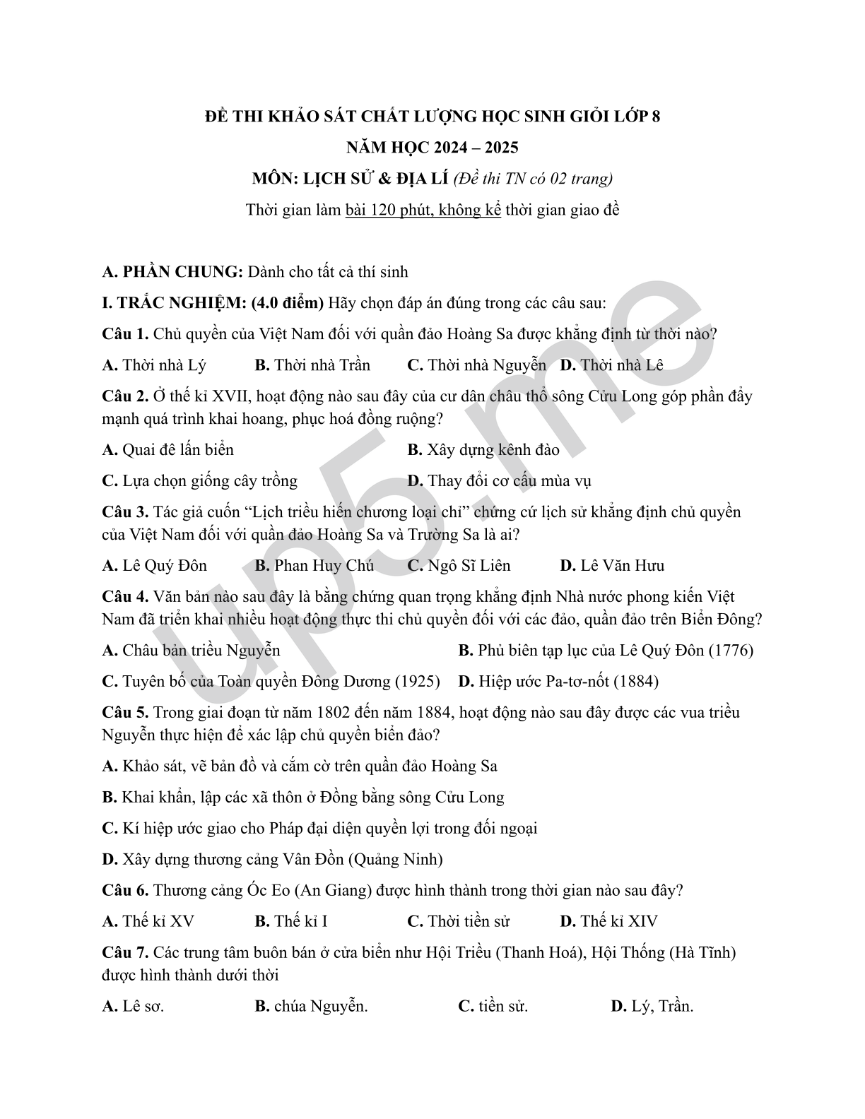 Câu 1. Chủ quyền của Việt Nam đối với quần đảo Hoàng Sa được khẳng định từ thời nào?