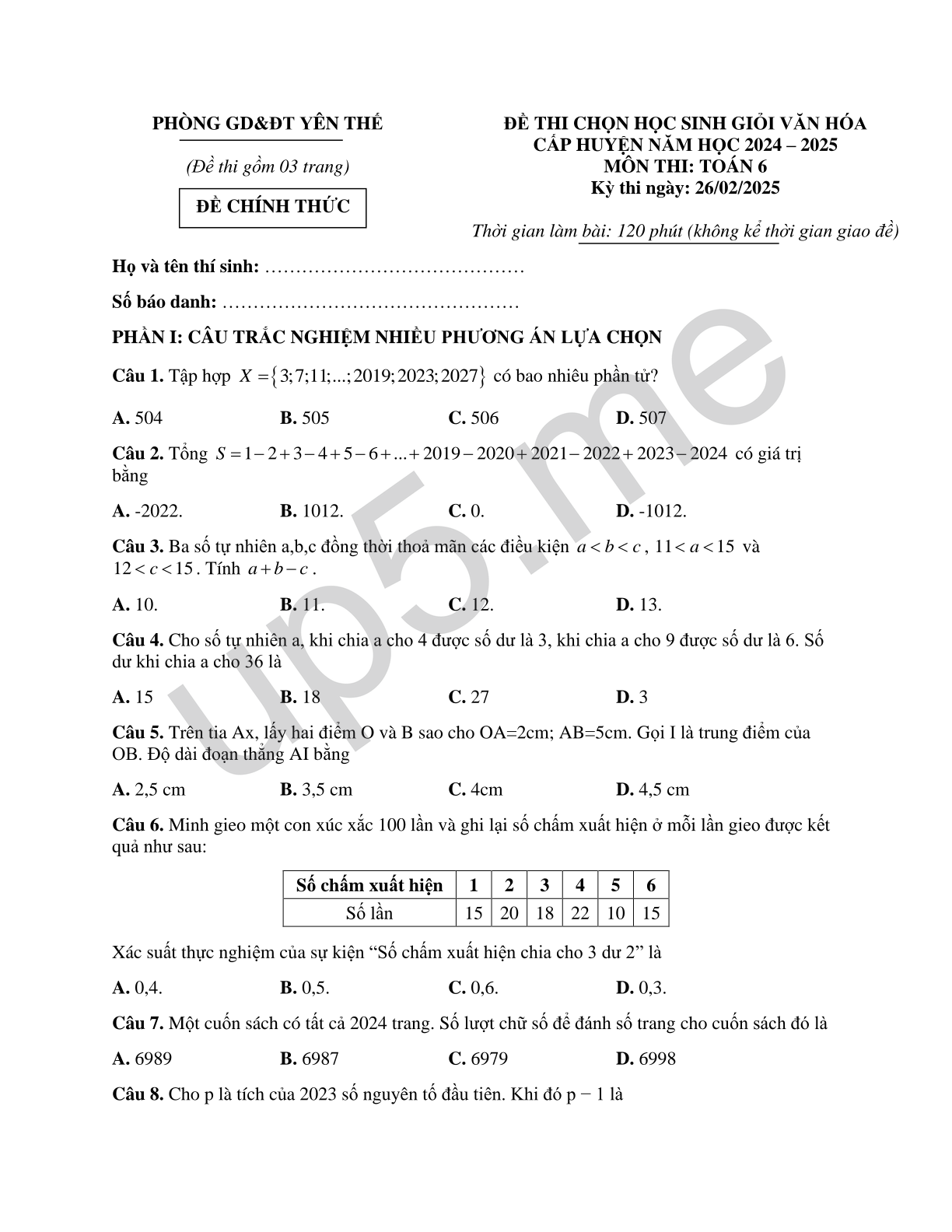 | PHÒNG GD&ĐT YÊN THẾ(Đề thi gồm 03 trang)ĐỀ CHÍNH THỨC | ĐỀ THI CHỌN HỌC SINH GIỎI VĂN HÓA CẤP HUYỆN NĂM HỌC 2024 – 2025MÔN THI: TOÁN 6Kỳ thi ngày: 26/02/2025Thời gian làm bài: 120 phút (không kể thời gian giao đề) |