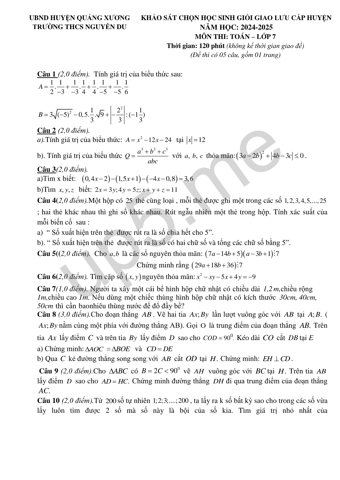 | UBND HUYỆN QUẢNG XƯƠNGTRƯỜNG THCS NGUYỄN DU | KHẢO SÁT CHỌN HỌC SINH GIỎI GIAO LƯU CẤP HUYỆN NĂM HỌC: 2024-2025MÔN THI: TOÁN – LỚP 7Thời gian: 120 phút (không kể thời gian giao đề)(Đề thi có 05 câu, gồm 01 trang) |