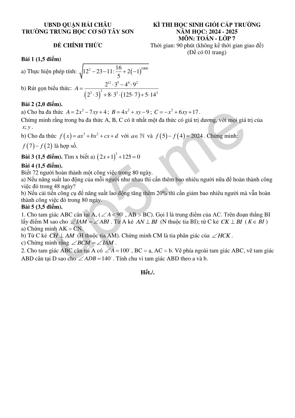 | UBND QUẬN HẢI CHÂUTRƯỜNG TRUNG HỌC CƠ SỞ TÂY SƠNĐỀ CHÍNH THỨC | KÌ THI HỌC SINH GIỎI CẤP TRƯỜNGNĂM HỌC: 2024 - 2025MÔN: TOÁN - LỚP 7Thời gian: 90 phút (không kể thời gian giao đề)(Đề có 01 trang) |