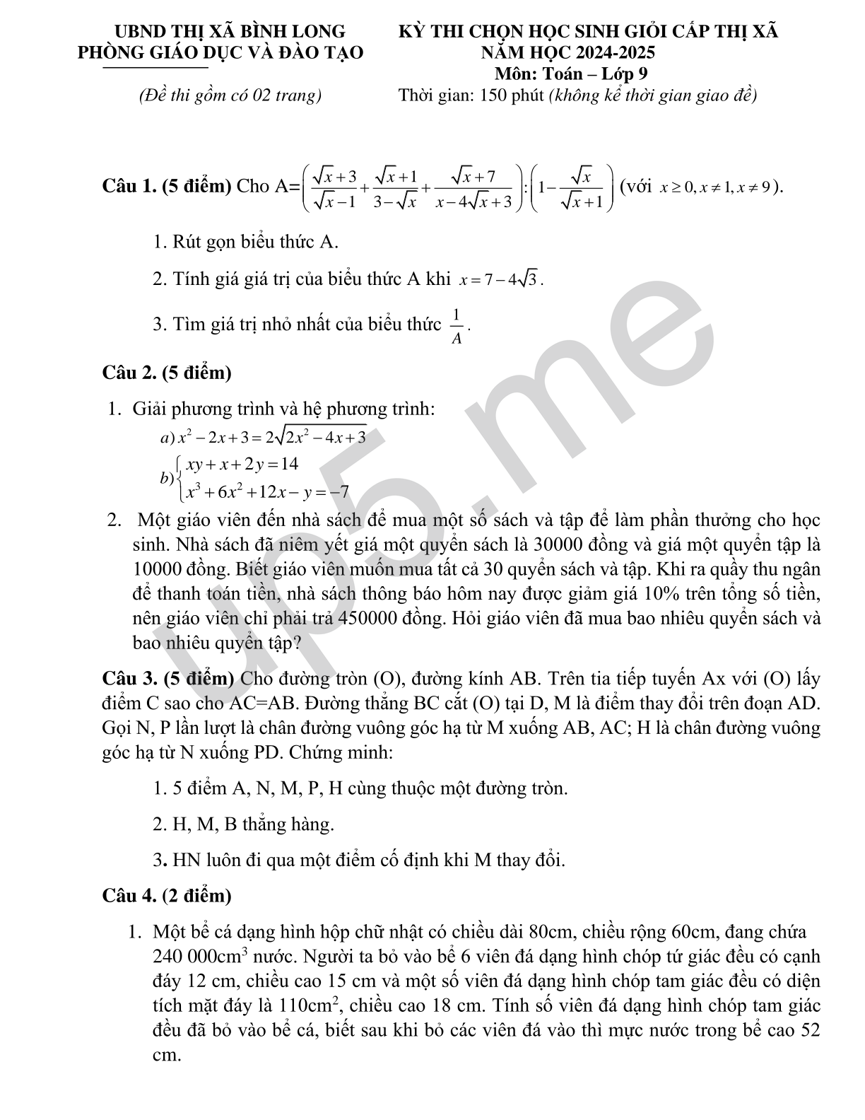 | UBND THỊ XÃ BÌNH LONGPHÒNG GIÁO DỤC VÀ ĐÀO TẠO(Đề thi gồm có 02 trang) | KỲ THI CHỌN HỌC SINH GIỎI CẤP THỊ XÃ NĂM HỌC 2024-2025 Môn: Toán – Lớp 9Thời gian: 150 phút (không kể thời gian giao đề) |