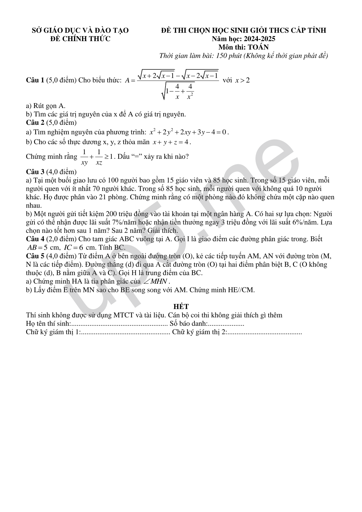 | SỞ GIÁO DỤC VÀ ĐÀO TẠOĐỀ CHÍNH THỨC | ĐỀ THI CHỌN HỌC SINH GIỎI THCS CẤP TỈNH Năm học: 2024-2025 Môn thi: TOÁN Thời gian làm bài: 150 phút (Không kể thời gian phát đề) |