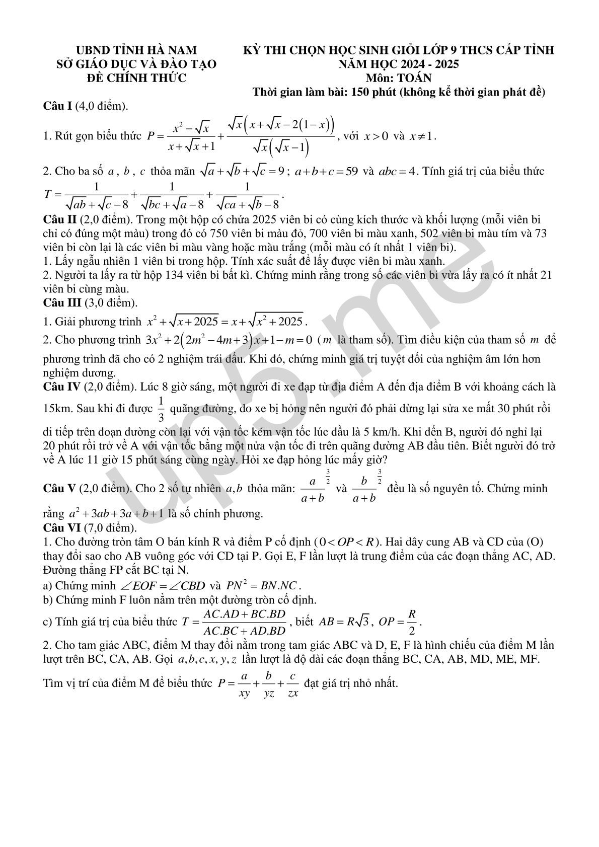 Đề thi HSG môn Toán 9 Sở GD&ĐT Hà Nam năm 2024-2025