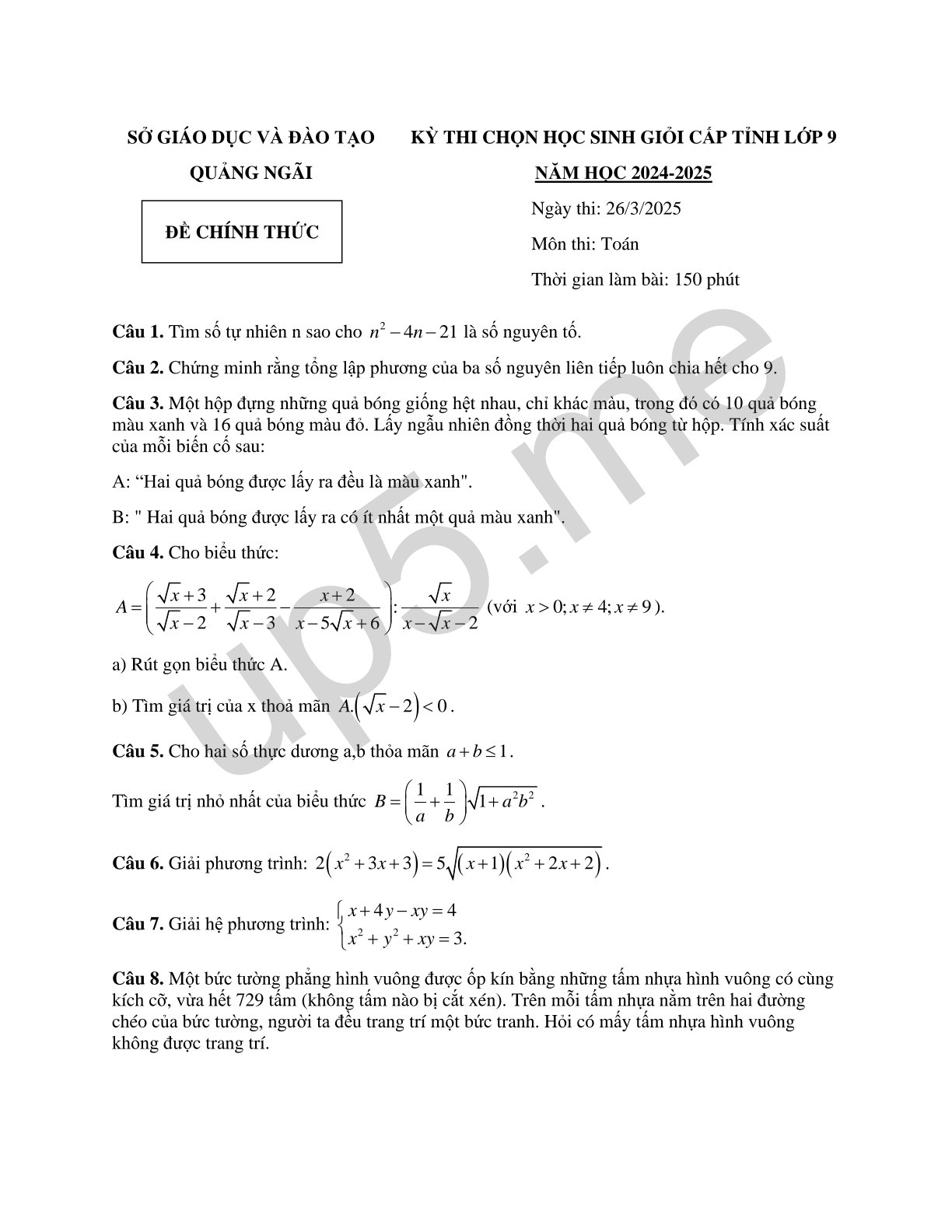 | SỞ GIÁO DỤC VÀ ĐÀO TẠOQUẢNG NGÃIĐỀ CHÍNH THỨC | KỲ THI CHỌN HỌC SINH GIỎI CẤP TỈNH LỚP 9NĂM HỌC 2024-2025Ngày thi: 26/3/2025Môn thi: ToánThời gian làm bài: 150 phút |