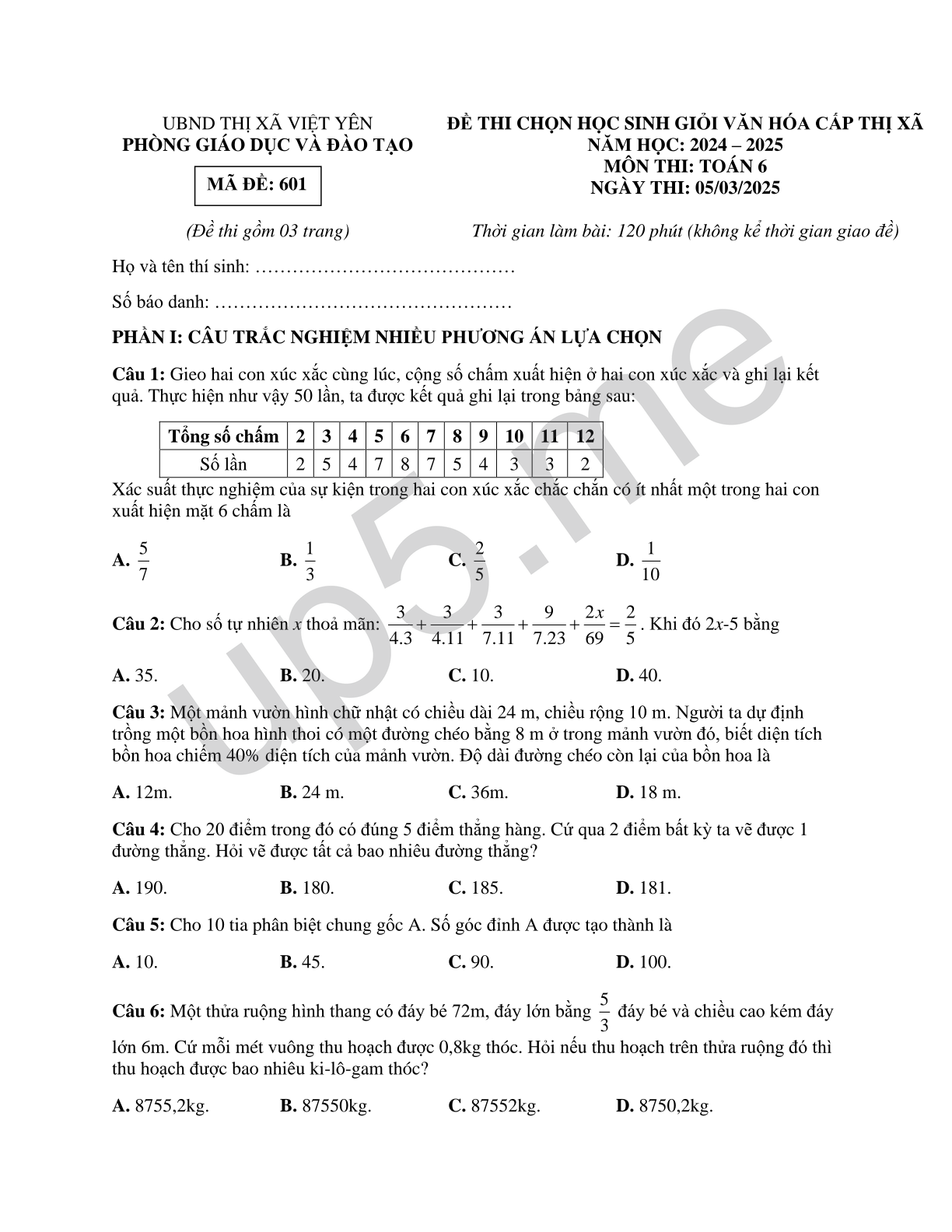 UBND THỊ XÃ VIỆT YÊNPHÒNG GIÁO DỤC VÀ ĐÀO TẠOMÃ ĐỀ: 601(Đề thi gồm 03 trang) |