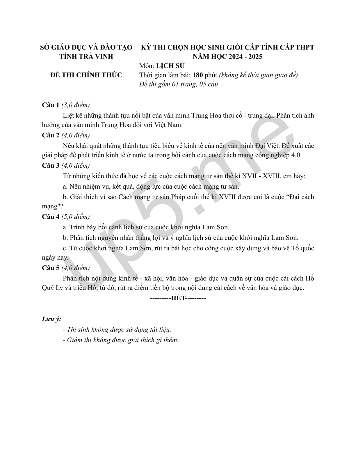 KỲ THI CHỌN HỌC SINH GIỎI CẤP TỈNH CẤP THPTNĂM HỌC 2024 - 2025Môn: LỊCH SỬThời gian làm bài: 180 phút (không kể thời gian giao đề)Đề thi gồm 01 trang, 05 câu |