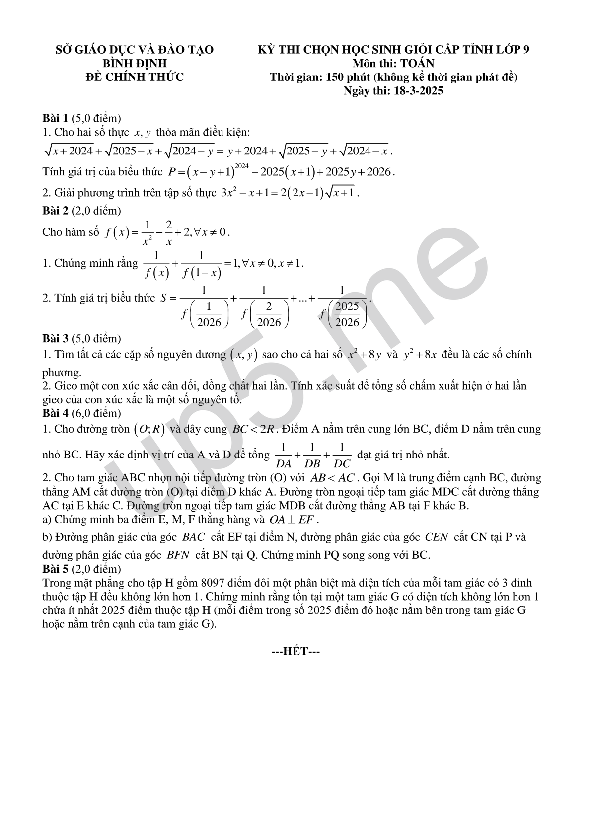 | SỞ GIÁO DỤC VÀ ĐÀO TẠOBÌNH ĐỊNHĐỀ CHÍNH THỨC | KỲ THI CHỌN HỌC SINH GIỎI CẤP TỈNH LỚP 9Môn thi: TOÁNThời gian: 150 phút (không kể thời gian phát đề)Ngày thi: 18-3-2025 |