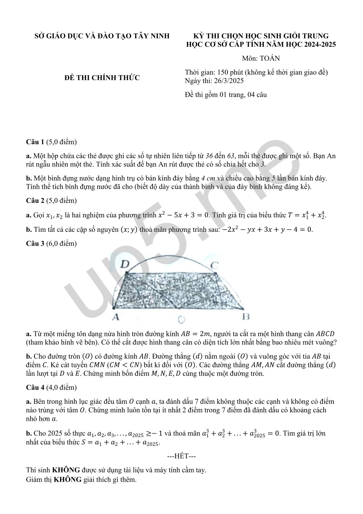 | SỞ GIÁO DỤC VÀ ĐÀO TẠO TÂY NINHĐỀ THI CHÍNH THỨC | KỲ THI CHỌN HỌC SINH GIỎI TRUNG HỌC CƠ SỞ CẤP TỈNH NĂM HỌC 2024-2025Môn: TOÁN Thời gian: 150 phút (không kể thời gian giao đề) Ngày thi: 26/3/2025 Đề thi gồm 01 trang, 04 câu |