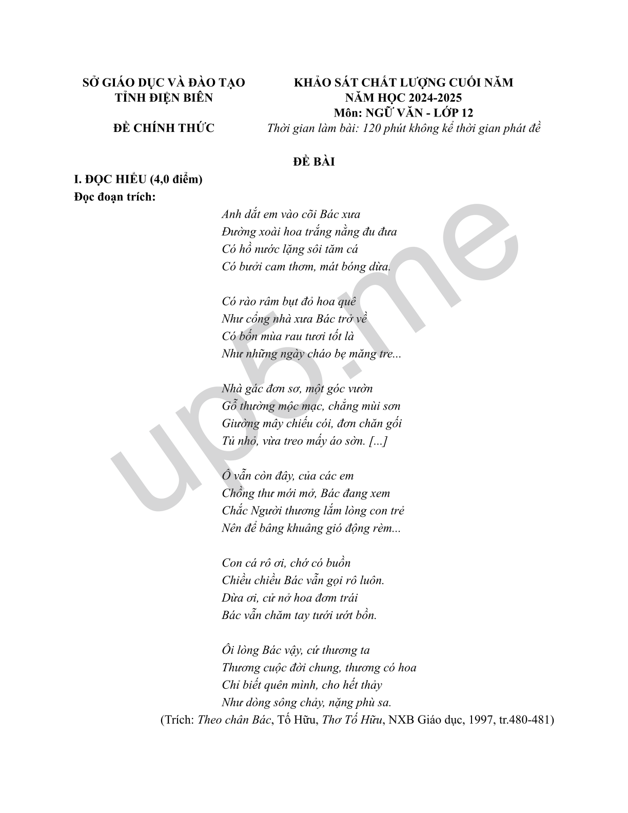 | SỞ GIÁO DỤC VÀ ĐÀO TẠOTỈNH ĐIỆN BIÊNĐỀ CHÍNH THỨC | KHẢO SÁT CHẤT LƯỢNG CUỐI NĂMNĂM HỌC 2024-2025Môn: NGỮ VĂN - LỚP 12Thời gian làm bài: 120 phút không kể thời gian phát đề |