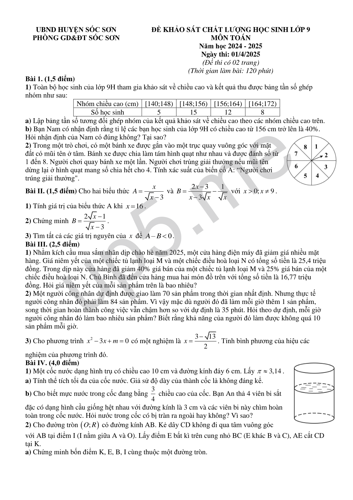 | UBND HUYỆN SÓC SƠNPHÒNG GD&ĐT SÓC SƠN | ĐỀ KHẢO SÁT CHẤT LƯỢNG HỌC SINH LỚP 9MÔN TOÁNNăm học 2024 - 2025Ngày thi: 01/4/2025(Đề thi có 02 trang)(Thời gian làm bài: 120 phút) |