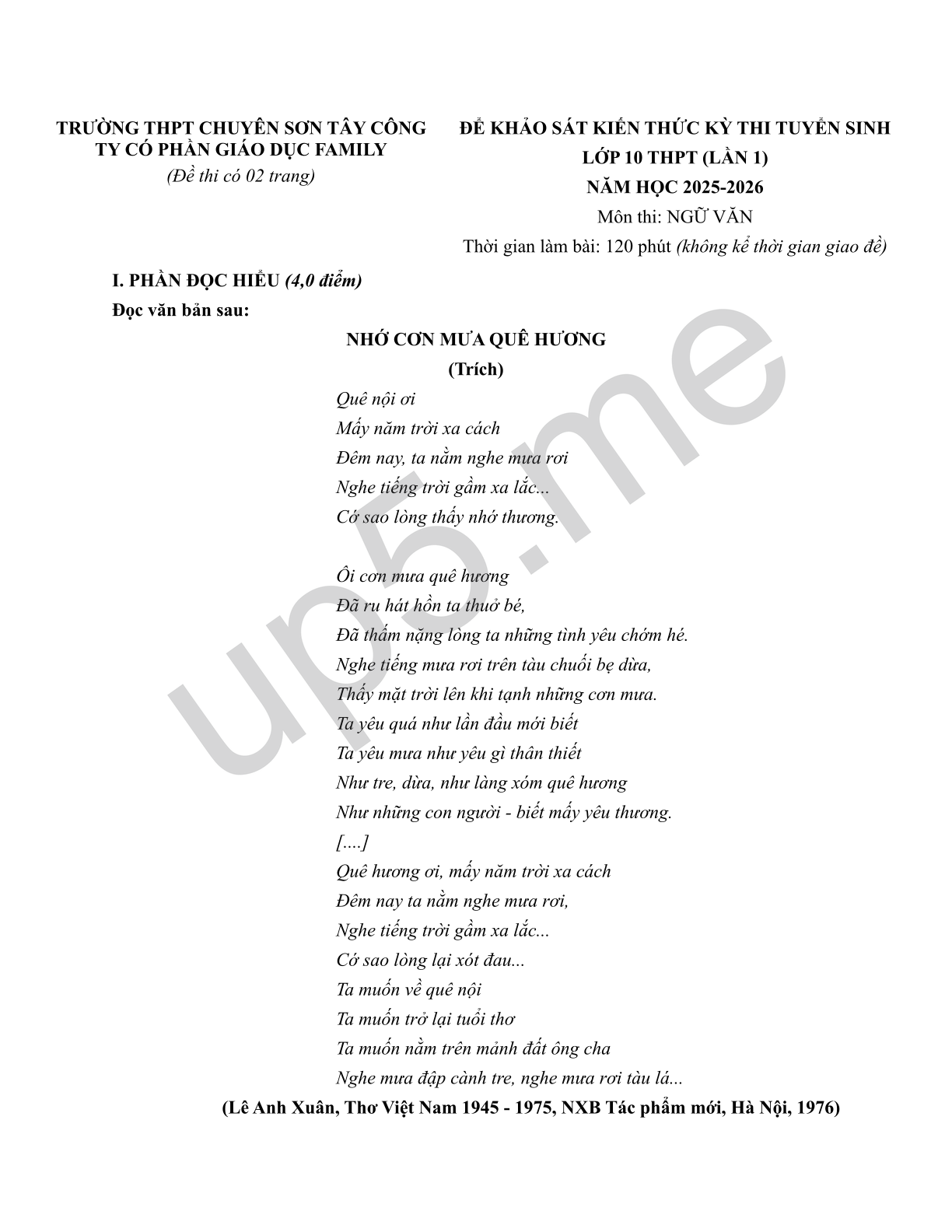 | TRƯỜNG THPT CHUYÊN SƠN TÂY CÔNG TY CÓ PHẦN GIÁO DỤC FAMILY (Đề thi có 02 trang) | ĐỂ KHẢO SÁT KIẾN THỨC KỲ THI TUYỂN SINHLỚP 10 THPT (LẦN 1)NĂM HỌC 2025-2026Môn thi: NGỮ VĂNThời gian làm bài: 120 phút (không kể thời gian giao đề) |