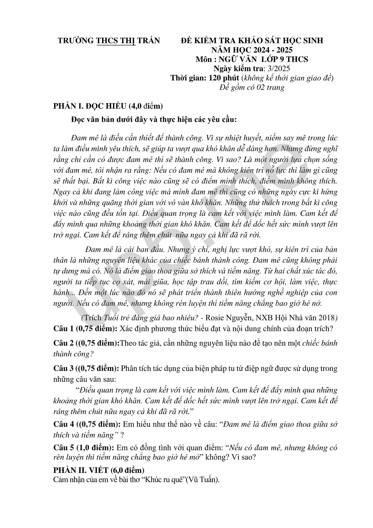 | TRƯỜNG THCS THỊ TRẤN | ĐỀ KIỂM TRA KHẢO SÁT HỌC SINH NĂM HỌC 2024 - 2025Môn : NGỮ VĂN LỚP 9 THCSNgày kiểm tra: 3/2025Thời gian: 120 phút (không kể thời gian giao đề)Đề gồm có 02 trang |
