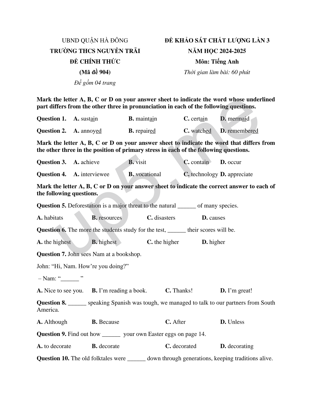 | UBND QUẬN HÀ ĐÔNGTRƯỜNG THCS NGUYỄN TRÃIĐỀ CHÍNH THỨC(Mã đề 904)Đề gồm 04 trang | ĐỀ KHẢO SÁT CHẤT LƯỢNG LẦN 3NĂM HỌC 2024-2025Môn: Tiếng AnhThời gian làm bài: 60 phút |