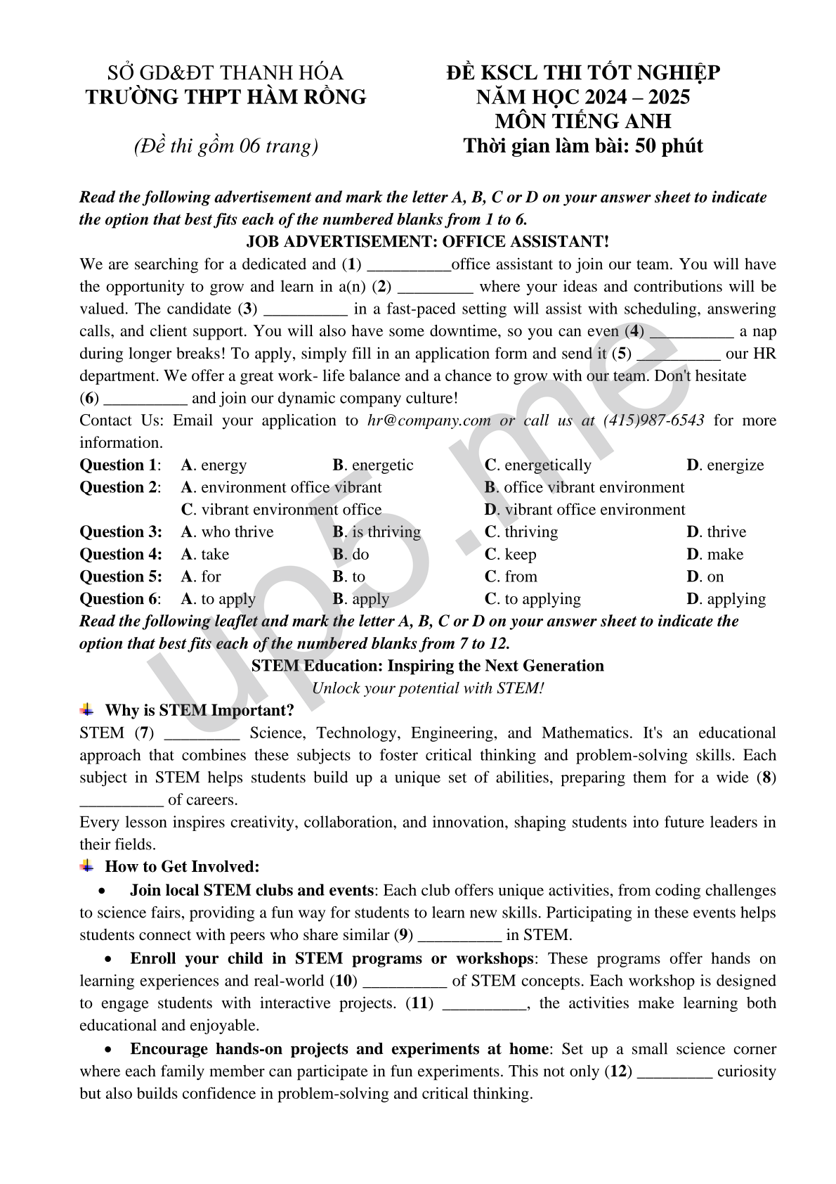 | SỞ GD&ĐT THANH HÓATRƯỜNG THPT HÀM RỒNG(Đề thi gồm 06 trang) | ĐỀ KSCL THI TỐT NGHIỆPNĂM HỌC 2024 – 2025MÔN TIẾNG ANHThời gian làm bài: 50 phút |