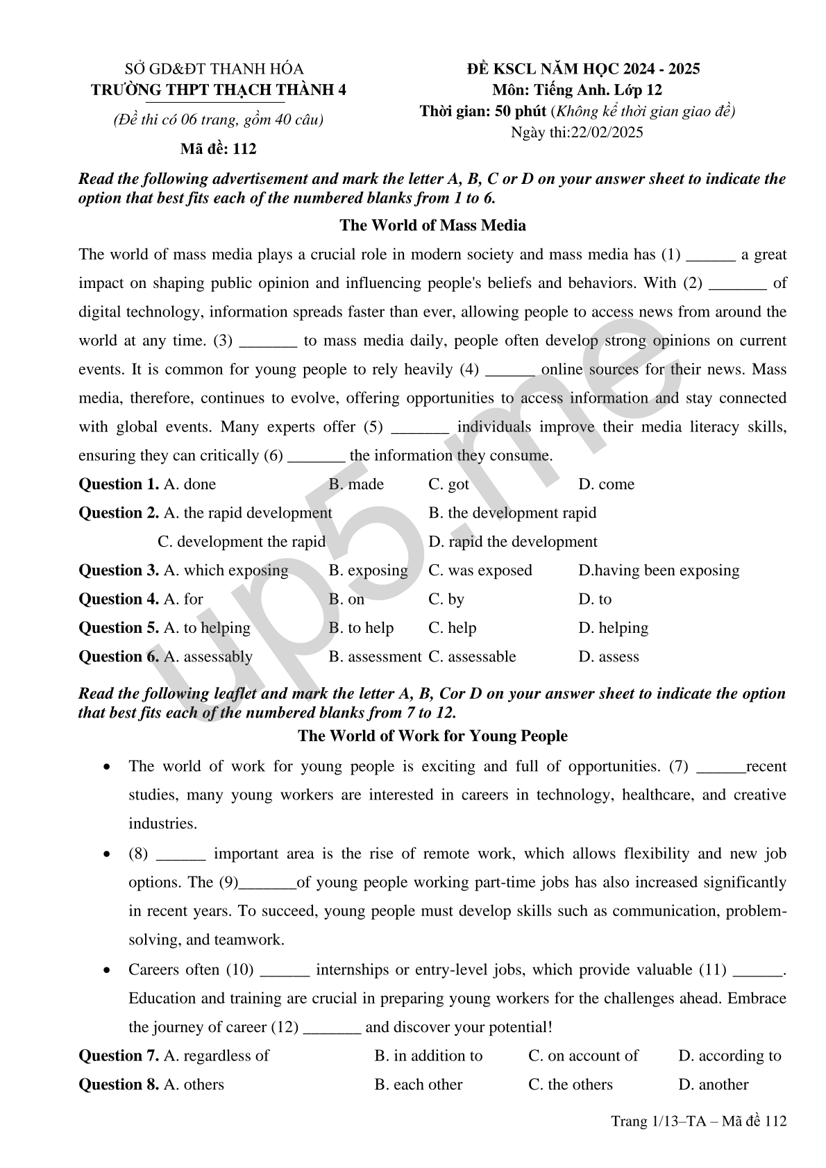 | SỞ GD&ĐT THANH HÓATRƯỜNG THPT THẠCH THÀNH 4(Đề thi có 06 trang, gồm 40 câu)Mã đề: 112 | ĐỀ KSCL NĂM HỌC 2024 - 2025Môn: Tiếng Anh. Lớp 12Thời gian: 50 phút (Không kể thời gian giao đề)Ngày thi:22/02/2025 |