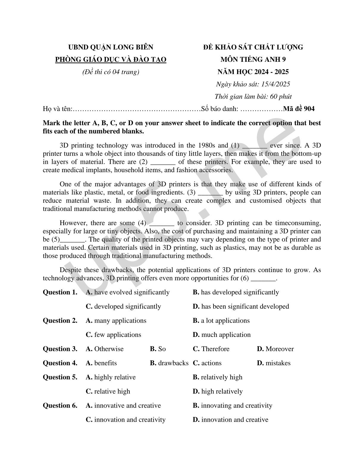 | UBND QUẬN LONG BIÊNPHÒNG GIÁO DỤC VÀ ĐÀO TẠO(Đề thi có 04 trang) | ĐỀ KHẢO SÁT CHẤT LƯỢNGMÔN TIẾNG ANH 9NĂM HỌC 2024 - 2025Ngày khảo sát: 15/4/2025Thời gian làm bài: 60 phút |