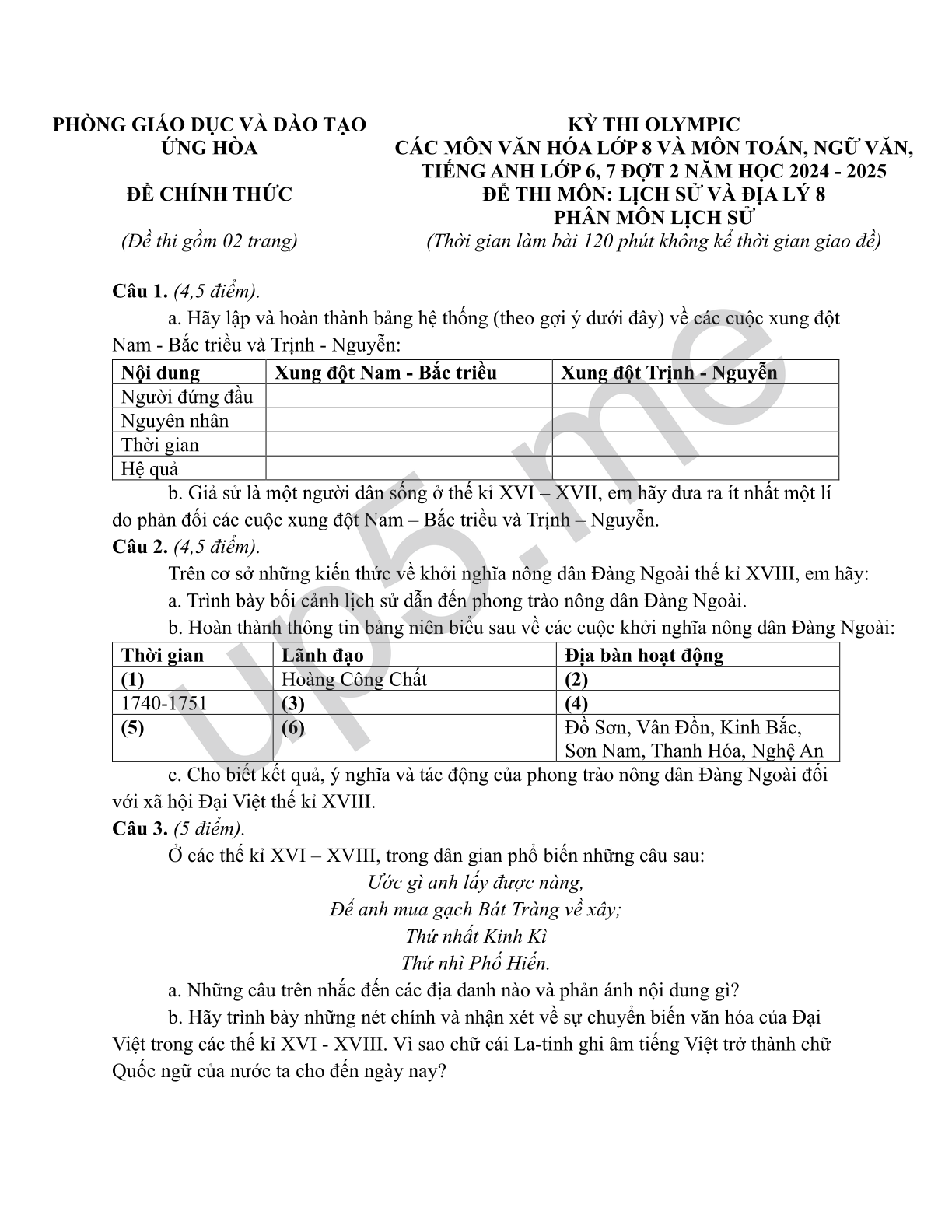 | PHÒNG GIÁO DỤC VÀ ĐÀO TẠOỨNG HÒAĐỀ CHÍNH THỨC(Đề thi gồm 02 trang) | KỲ THI OLYMPICCÁC MÔN VĂN HÓA LỚP 8 VÀ MÔN TOÁN, NGỮ VĂN, TIẾNG ANH LỚP 6, 7 ĐỢT 2 NĂM HỌC 2024 - 2025ĐỂ THI MÔN: LỊCH SỬ VÀ ĐỊA LÝ 8PHÂN MÔN LỊCH SỬ(Thời gian làm bài 120 phút không kể thời gian giao đề) |
