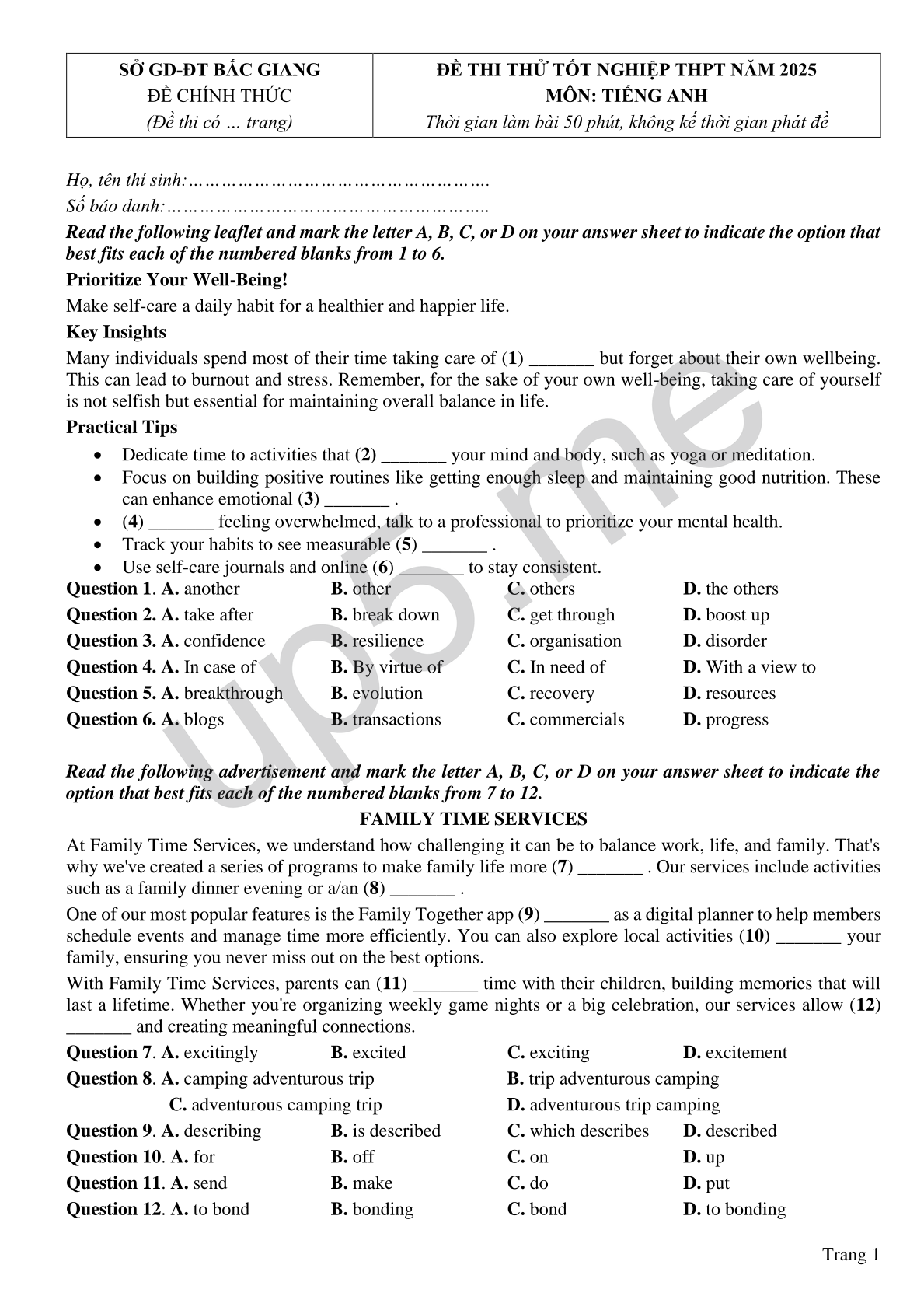 | SỞ GD-ĐT BẮC GIANGĐỀ CHÍNH THỨC(Đề thi có … trang) | ĐỀ THI THỬ TỐT NGHIỆP THPT NĂM 2025MÔN: TIẾNG ANHThời gian làm bài 50 phút, không kế thời gian phát đề |