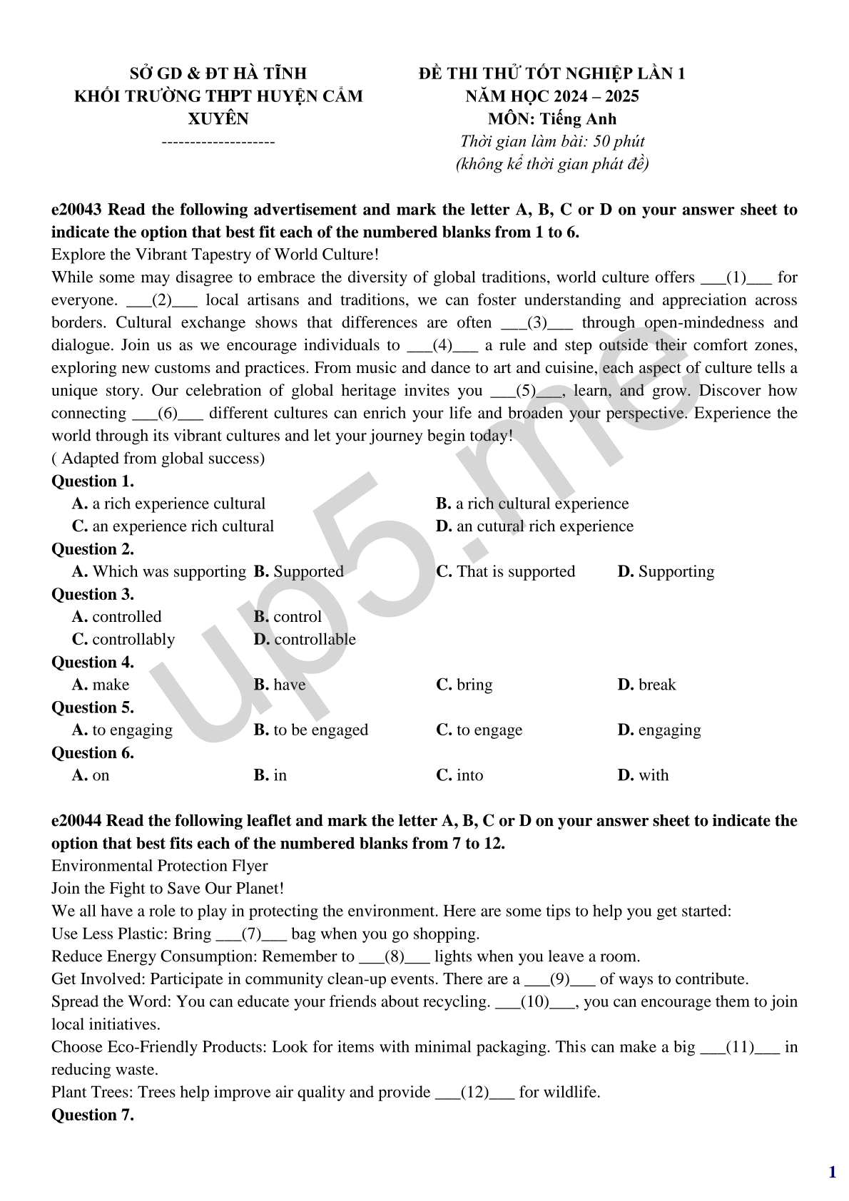 ĐỀ THI THỬ TỐT NGHIỆP LẦN 1 NĂM HỌC 2024 – 2025 MÔN: Tiếng Anh Thời gian làm bài: 50 phút(không kể thời gian phát đề) |