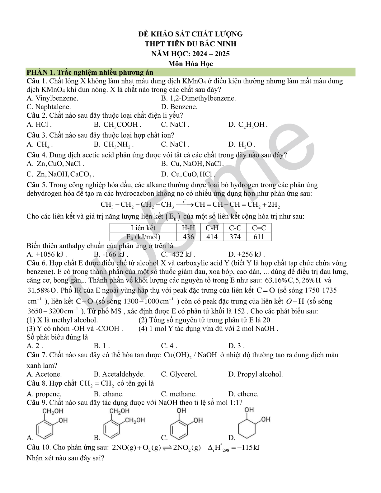 Câu 1. Chất lỏng X không làm nhạt màu dung dịch KMnO4 ở điều kiện thường nhưng làm mất màu dung dịch KMnO4 khi đun nóng. X là chất nào trong các chất sau đây?
