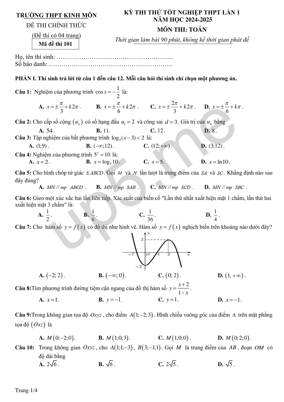 TRƯỜNG THPT KINH MÔN ĐỀ THI CHÍNH THỨC (Đề thi có 04 trang) Mã đề thi 101 |