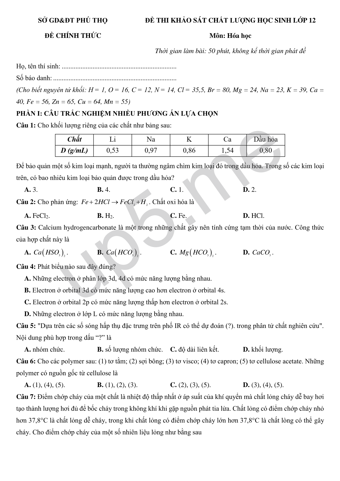 | SỞ GD&ĐT PHÚ THỌĐỀ CHÍNH THỨC | ĐỀ THI KHẢO SÁT CHẤT LƯỢNG HỌC SINH LỚP 12Môn: Hóa họcThời gian làm bài: 50 phút, không kể thời gian phát đề |