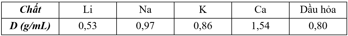 Để bảo quản một số kim loại mạnh, người ta thường ngâm chìm kim loại đó trong dầu hỏa. Trong số các kim loại trên, có bao nhiêu kim loại bảo quản được trong dầu hỏa?