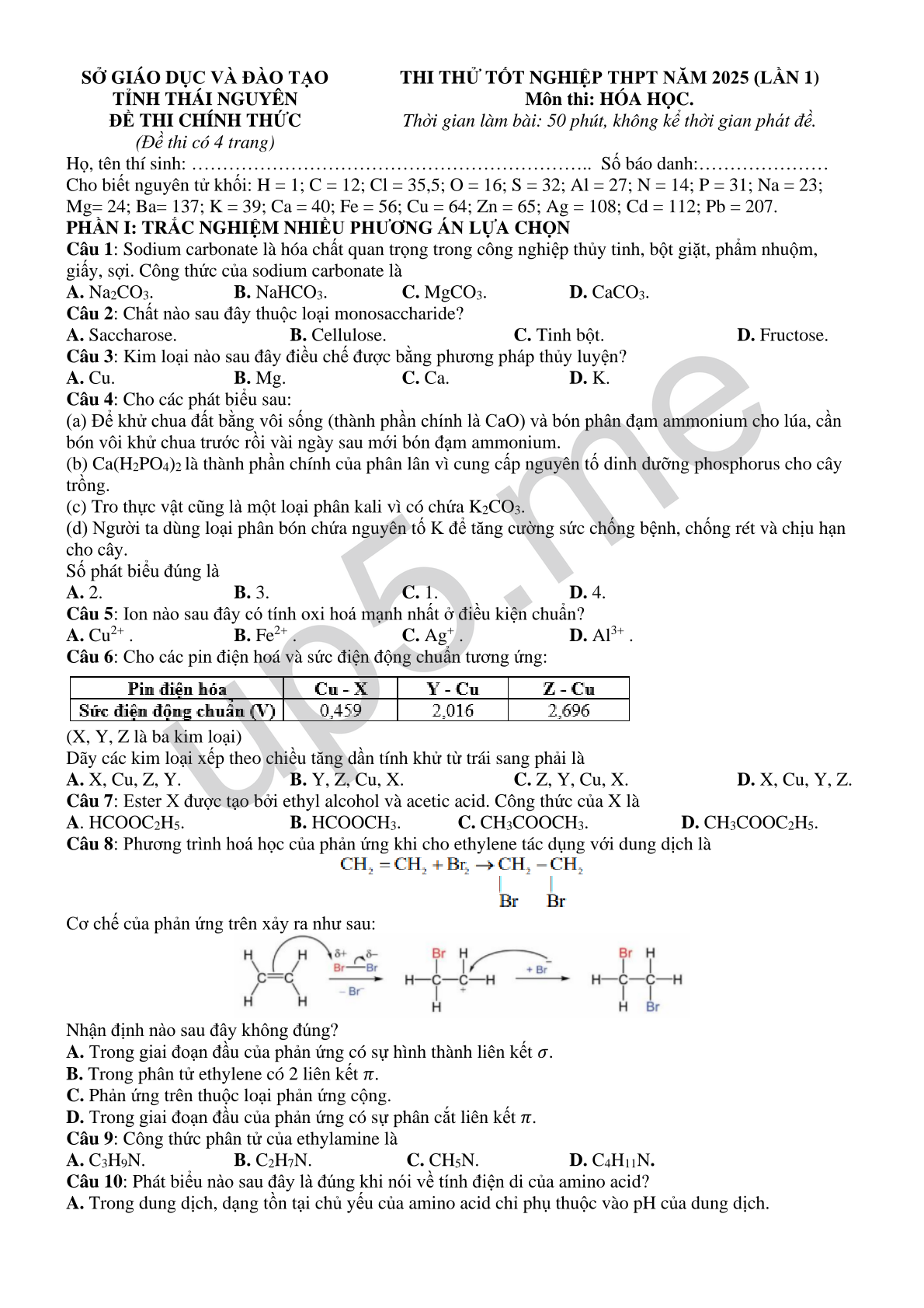 | SỞ GIÁO DỤC VÀ ĐÀO TẠOTỈNH THÁI NGUYÊNĐỀ THI CHÍNH THỨC(Đề thi có 4 trang) | THI THỬ TỐT NGHIỆP THPT NĂM 2025 (LẦN 1)Môn thi: HÓA HỌC.Thời gian làm bài: 50 phút, không kể thời gian phát đề. |