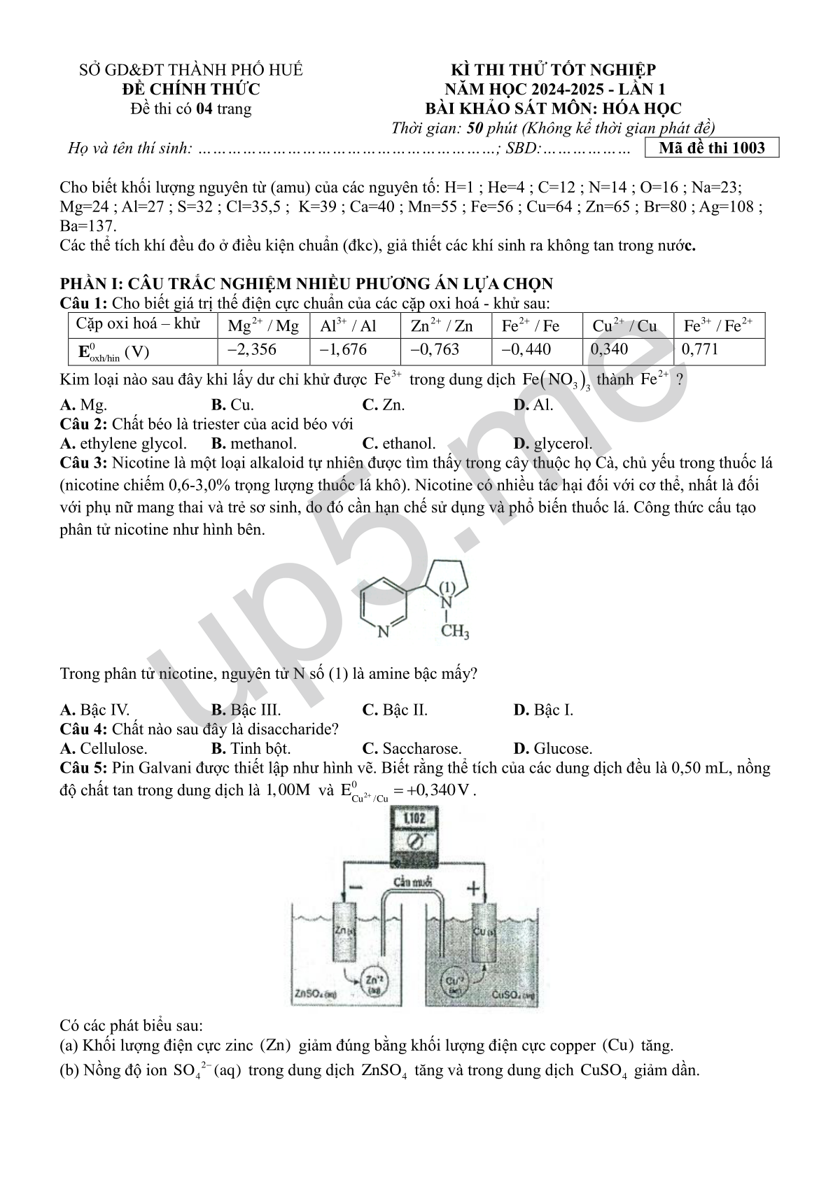 | SỞ GD&ĐT THÀNH PHỐ HUẾĐỀ CHÍNH THỨCĐề thi có 04 trang | KÌ THI THỬ TỐT NGHIỆP NĂM HỌC 2024-2025 - LẦN 1BÀI KHẢO SÁT MÔN: HÓA HỌCThời gian: 50 phút (Không kể thời gian phát đề) | |