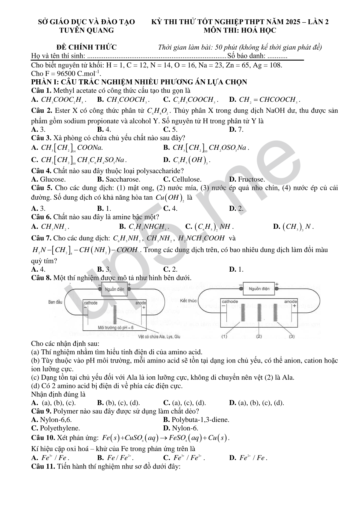 | SỞ GIÁO DỤC VÀ ĐÀO TẠOTUYÊN QUANGĐỀ CHÍNH THỨC | KỲ THI THỬ TỐT NGHIỆP THPT NĂM 2025 – LẦN 2MÔN THI: HOÁ HỌCThời gian làm bài: 50 phút (không kể thời gian phát đề) | ||