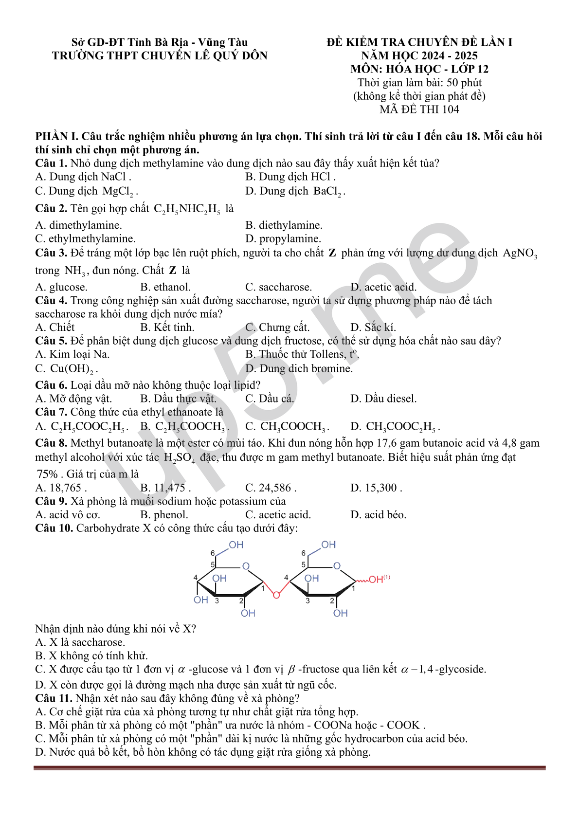 ĐỀ KIỂM TRA CHUYÊN ĐỀ LẦN I NĂM HỌC 2024 - 2025 MÔN: HÓA HỌC - LỚP 12 Thời gian làm bài: 50 phút (không kể thời gian phát đề) MÃ ĐỀ THI 104 |