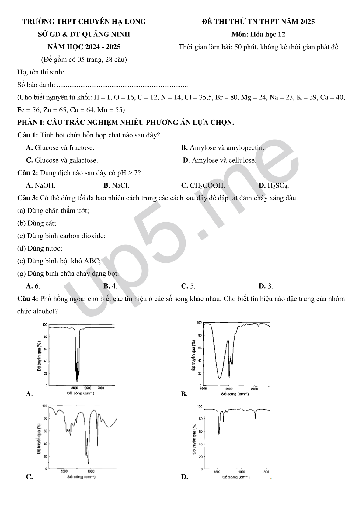 | TRƯỜNG THPT CHUYÊN HẠ LONGSỞ GD & ĐT QUẢNG NINHNĂM HỌC 2024 - 2025(Đề gồm có 05 trang, 28 câu) | ĐỀ THI THỬ TN THPT NĂM 2025Môn: Hóa học 12Thời gian làm bài: 50 phút, không kể thời gian phát đề |