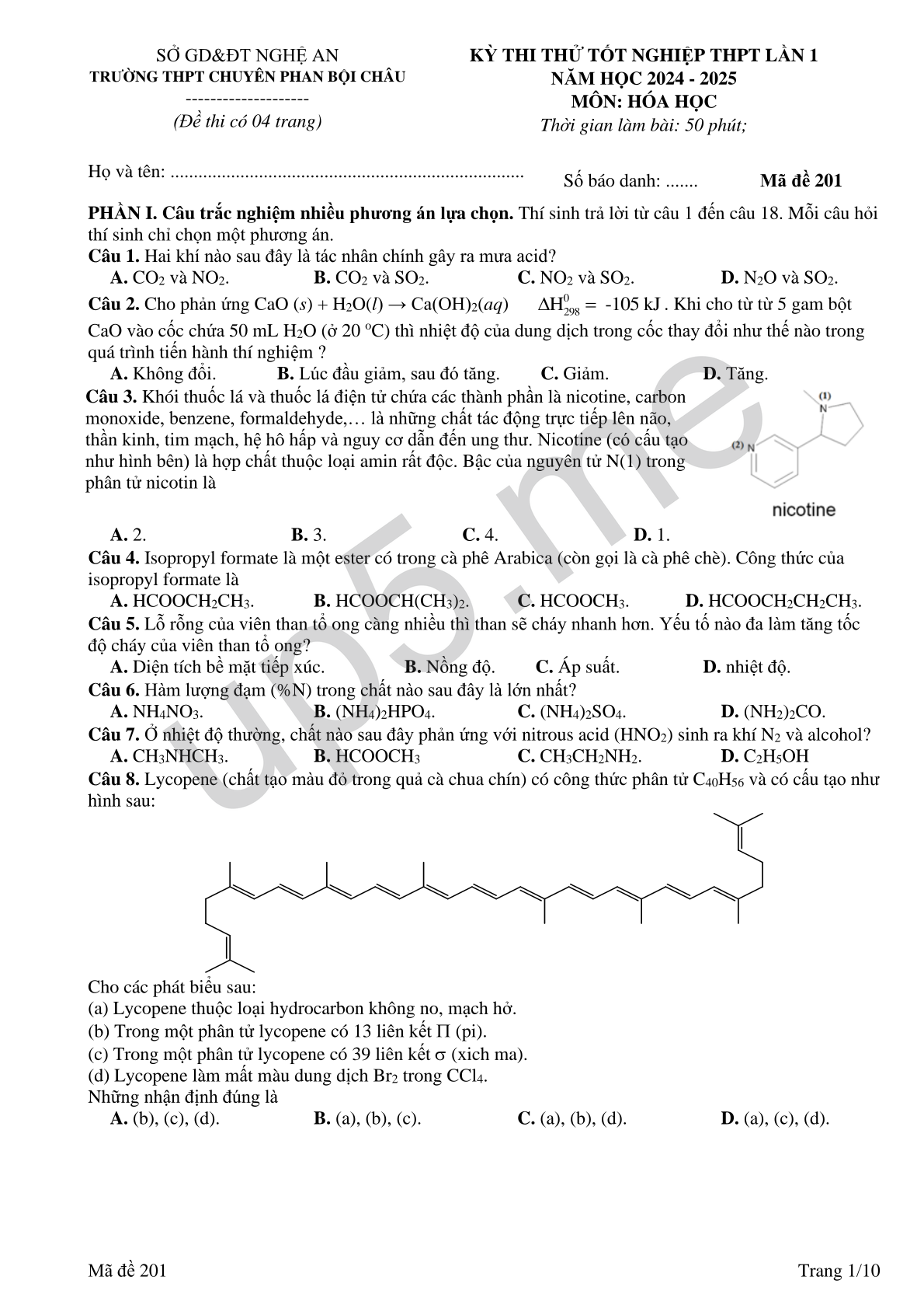 KỲ THI THỬ TỐT NGHIỆP THPT LẦN 1 NĂM HỌC 2024 - 2025 MÔN: HÓA HỌC Thời gian làm bài: 50 phút; |