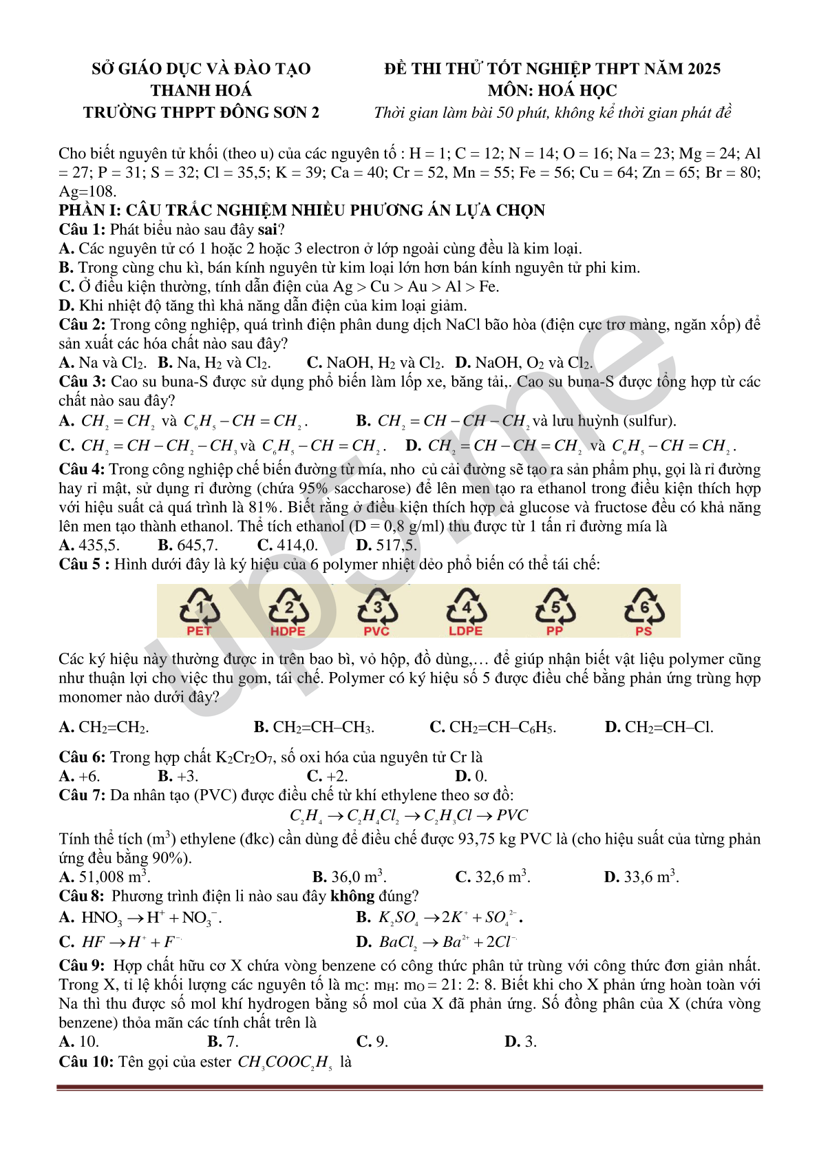 | SỞ GIÁO DỤC VÀ ĐÀO TẠO THANH HOÁTRƯỜNG THPPT ĐÔNG SƠN 2 | ĐỀ THI THỬ TỐT NGHIỆP THPT NĂM 2025MÔN: HOÁ HỌC Thời gian làm bài 50 phút, không kể thời gian phát đề |
