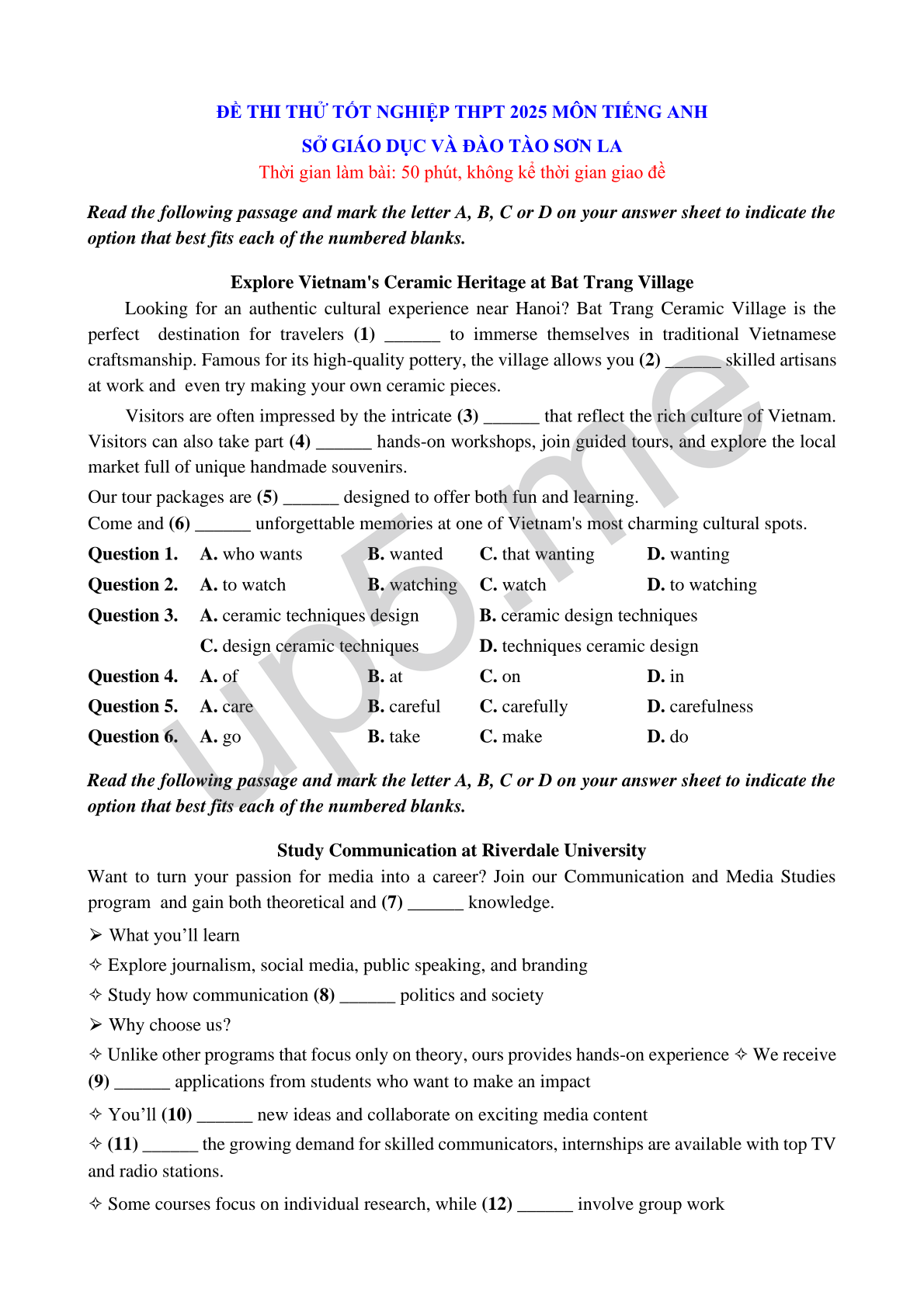 Looking for an authentic cultural experience near Hanoi? Bat Trang Ceramic Village is the perfect destination for travelers (1) ______ to immerse themselves in traditional Vietnamese craftsmanship. Famous for its high-quality pottery, the village allows you (2) ______ skilled artisans at work and even try making your own ceramic pieces.