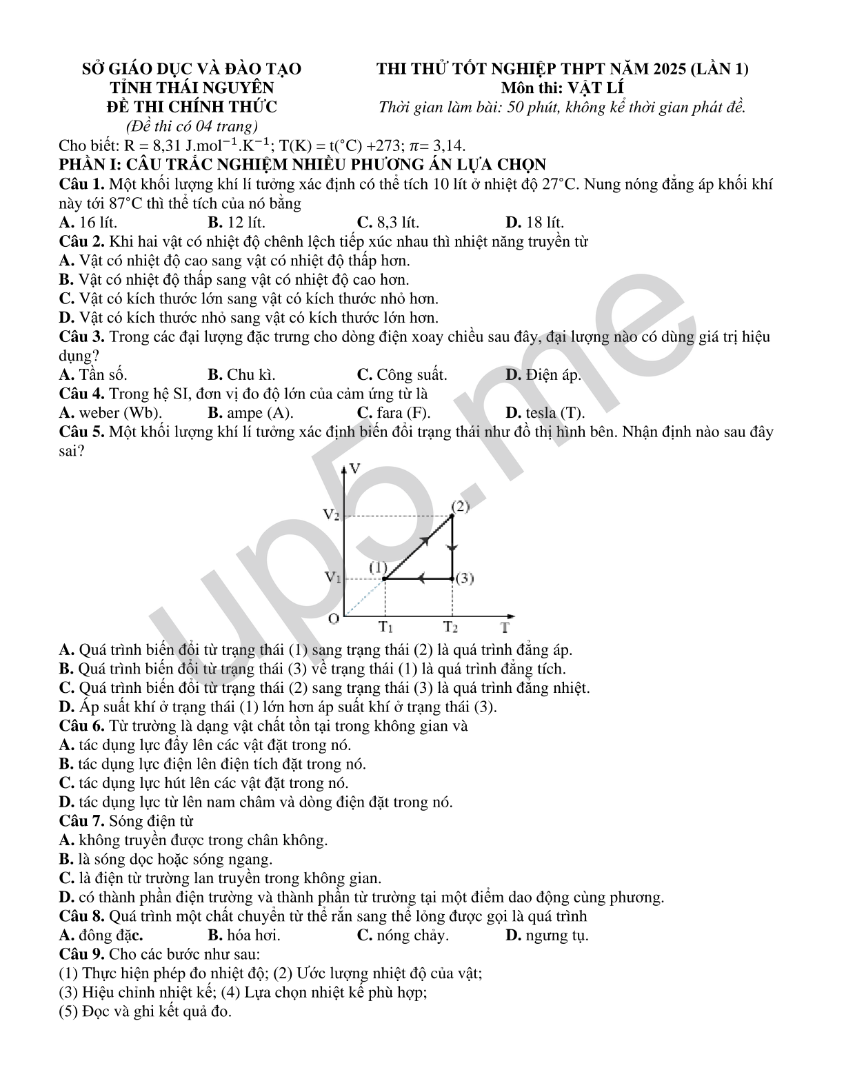 | SỞ GIÁO DỤC VÀ ĐÀO TẠOTỈNH THÁI NGUYÊNĐỀ THI CHÍNH THỨC(Đề thi có 04 trang) | THI THỬ TỐT NGHIỆP THPT NĂM 2025 (LẦN 1)Môn thi: VẬT LÍThời gian làm bài: 50 phút, không kể thời gian phát đề. |