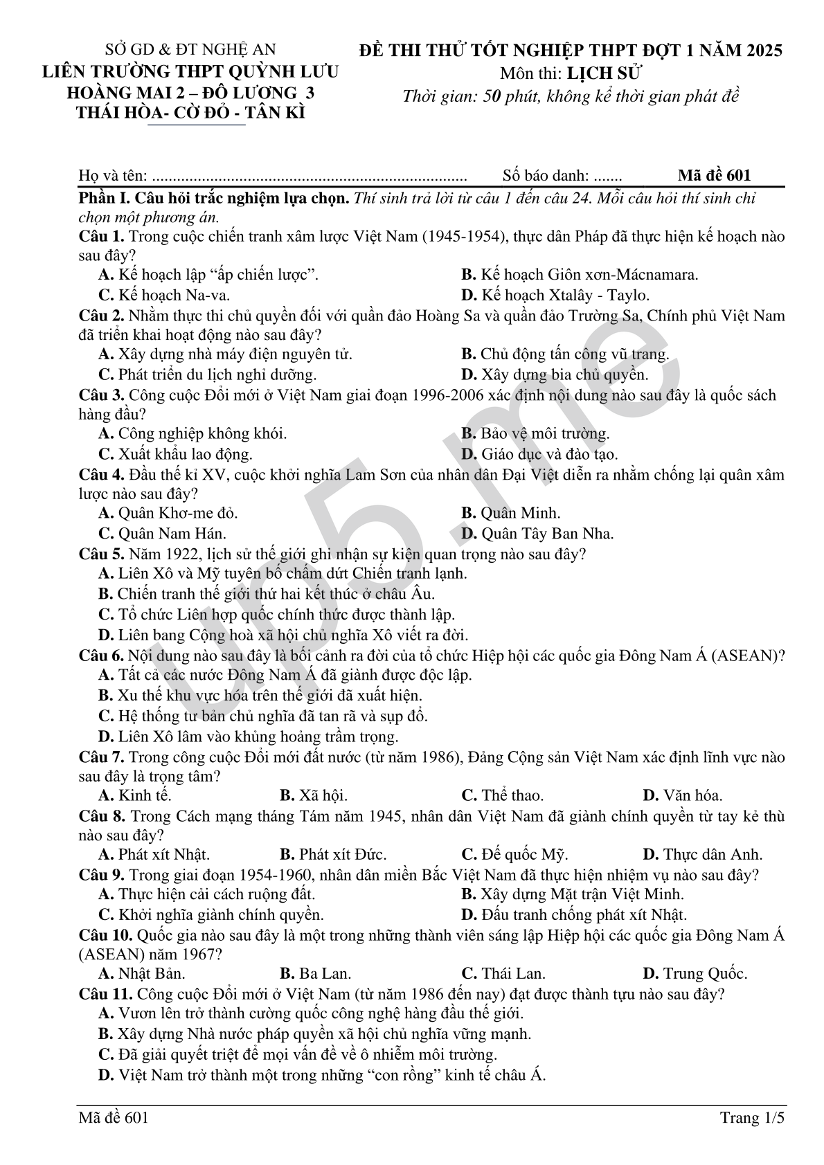 | SỞ GD & ĐT NGHỆ ANLIÊN TRƯỜNG THPT QUỲNH LƯUHOÀNG MAI 2 – ĐÔ LƯƠNG 3THÁI HÒA- CỜ ĐỎ - TÂN KÌ | ĐỀ THI THỬ TỐT NGHIỆP THPT ĐỢT 1 NĂM 2025 Môn thi: LỊCH SỬ Thời gian: 50 phút, không kể thời gian phát đề |