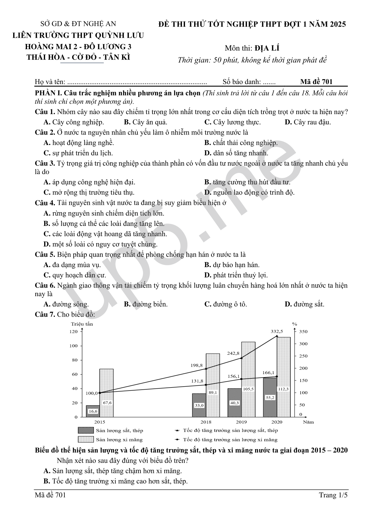| Họ và tên: ............................................................................ | Số báo danh: ....... | Mã đề 701 |