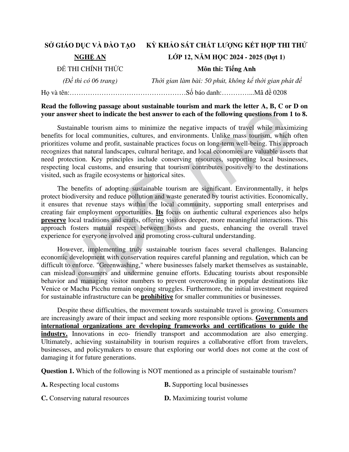 | SỞ GIÁO DỤC VÀ ĐÀO TẠONGHỆ ANĐỀ THI CHÍNH THỨC(Đề thi có 06 trang) | KỲ KHẢO SÁT CHẤT LƯỢNG KẾT HỢP THI THỬLỚP 12, NĂM HỌC 2024 - 2025 (Đợt 1)Môn thi: Tiếng AnhThời gian làm bài: 50 phút, không kể thời gian phát đề |