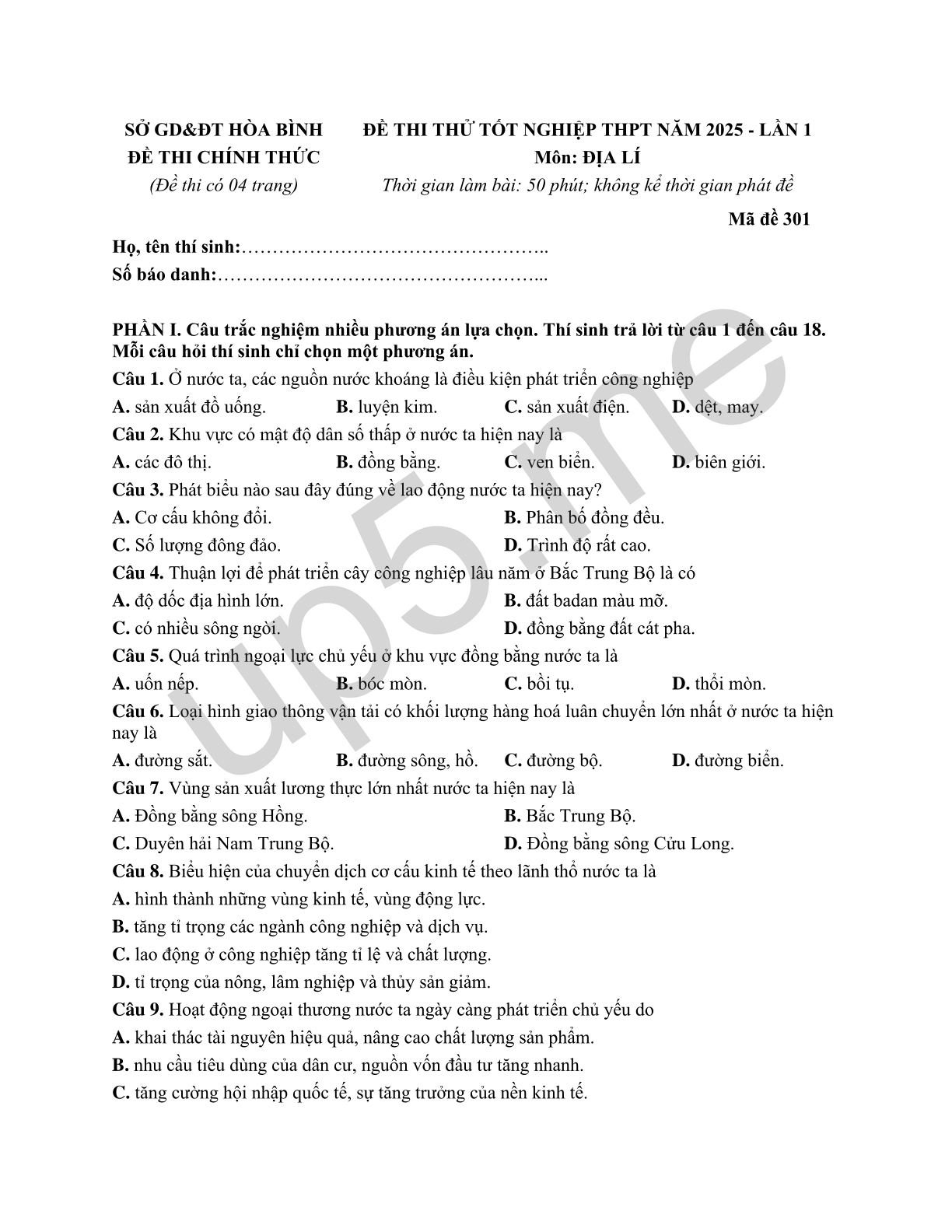 SỞ GD&ĐT HÒA BÌNHĐỀ THI CHÍNH THỨC(Đề thi có 04 trang) Mã đề 301 |