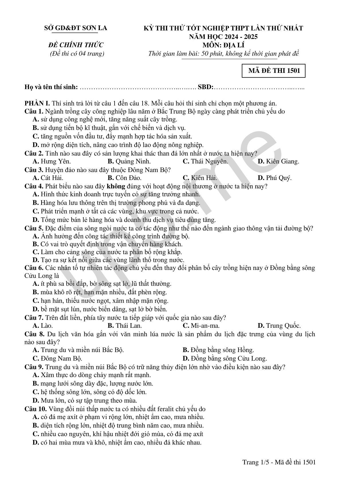SỞ GD&ĐT SƠN LAĐỀ CHÍNH THỨC(Đề thi có 04 trang) MÃ ĐỀ THI 1501 |
