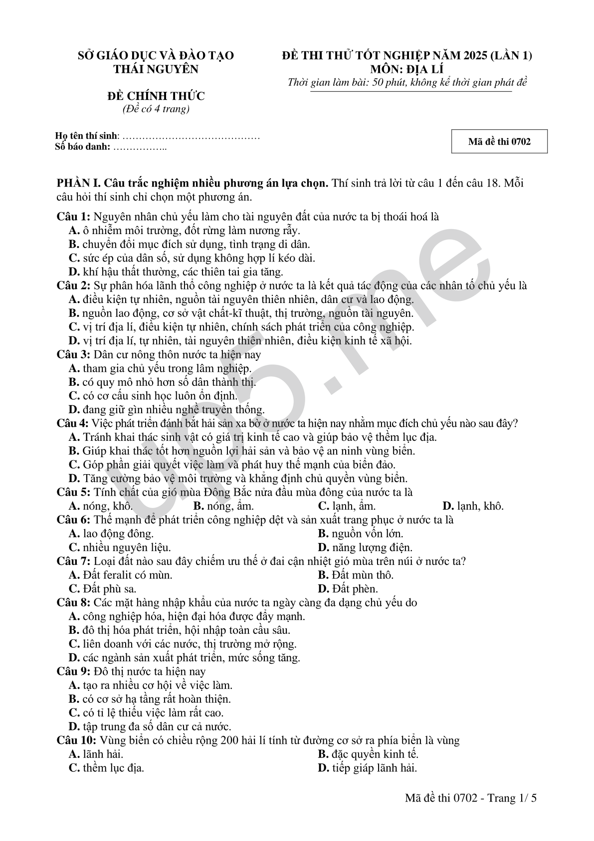 ĐỀ THI THỬ TỐT NGHIỆP NĂM 2025 (LẦN 1) MÔN: ĐỊA LÍThời gian làm bài: 50 phút, không kể thời gian phát đề |