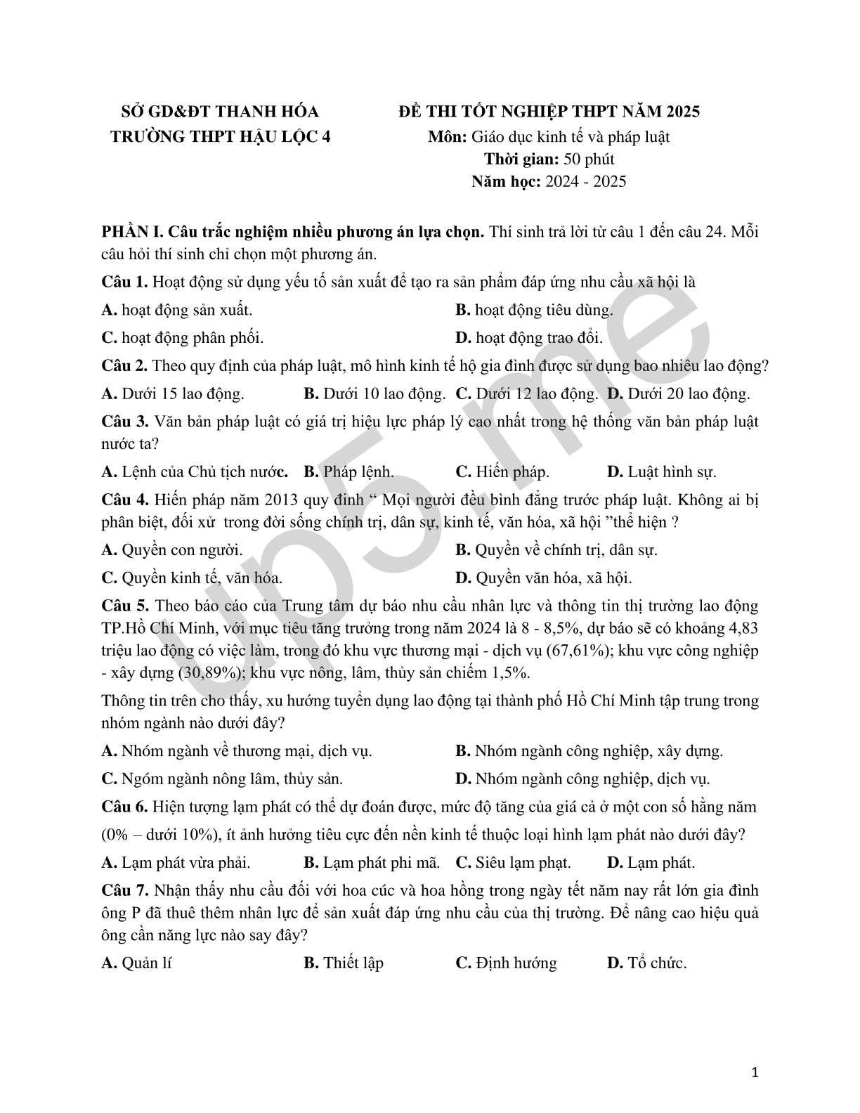 | SỞ GD&ĐT THANH HÓA | ĐỀ THI TỐT NGHIỆP THPT NĂM 2025 |