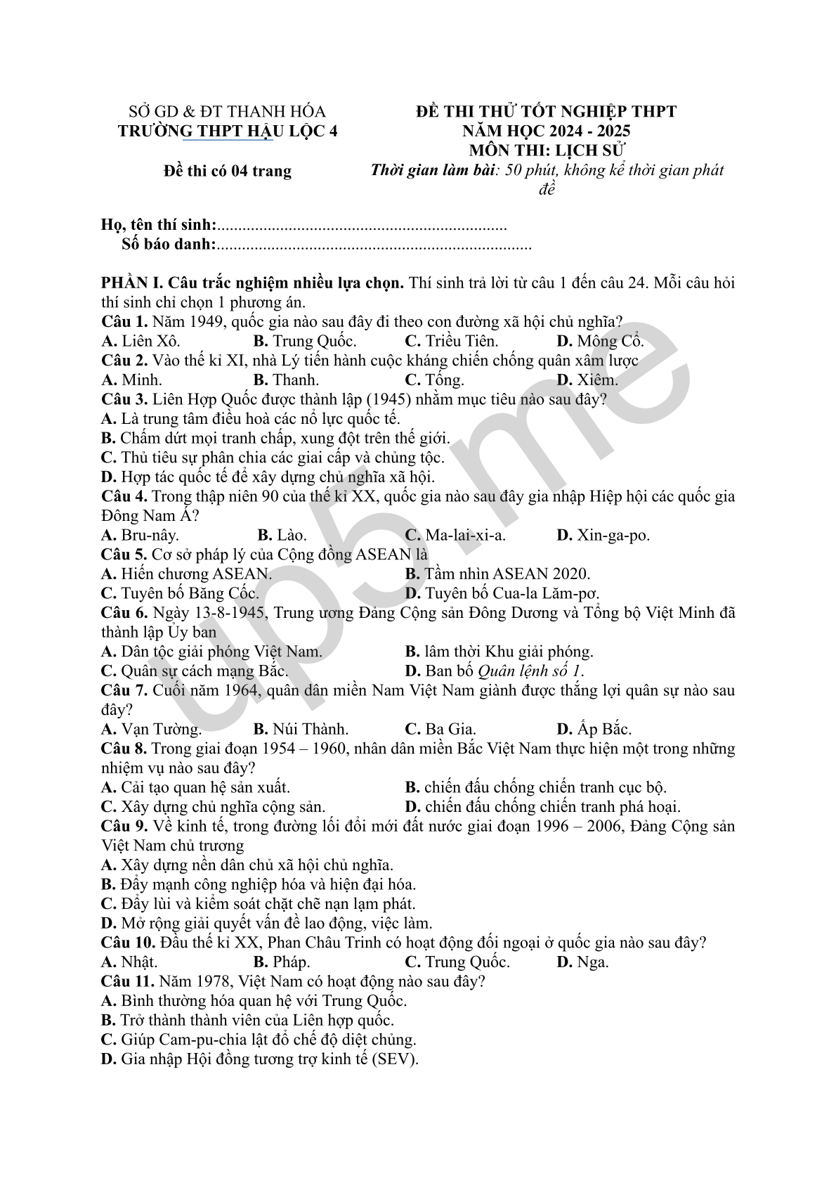 | SỞ GD & ĐT THANH HÓATRƯỜNG THPT HẬU LỘC 4Đề thi có 04 trang | ĐỀ THI THỬ TỐT NGHIỆP THPTNĂM HỌC 2024 - 2025MÔN THI: LỊCH SỬThời gian làm bài: 50 phút, không kể thời gian phát đề |