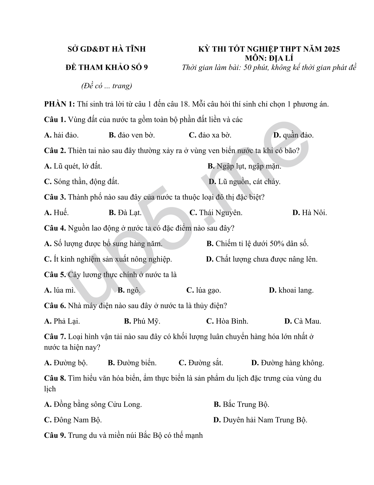 | SỞ GD&ĐT HÀ TĨNHĐỀ THAM KHẢO SỐ 9(Đề có ... trang) | KỲ THI TỐT NGHIỆP THPT NĂM 2025MÔN: ĐỊA LÍThời gian làm bài: 50 phút, không kể thời gian phát đề |