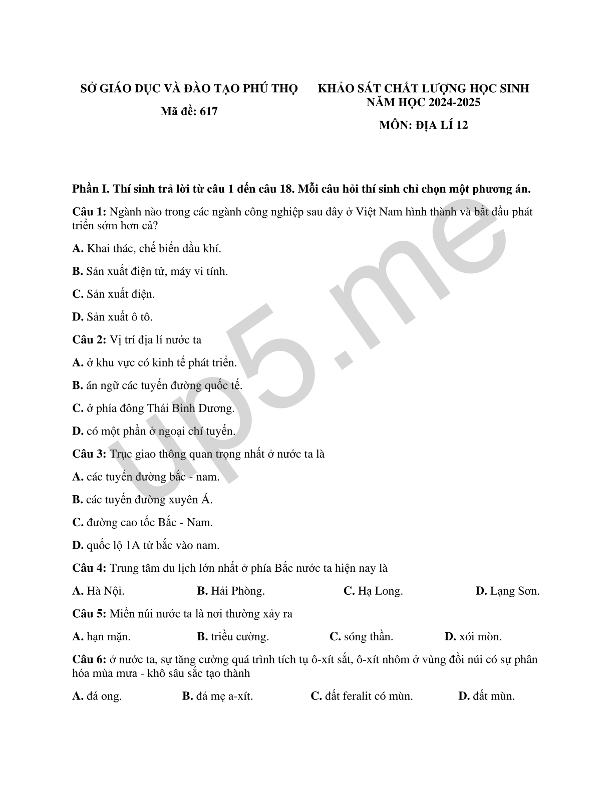 | SỞ GIÁO DỤC VÀ ĐÀO TẠO PHÚ THỌMã đề: 617 | KHẢO SÁT CHẤT LƯỢNG HỌC SINH NĂM HỌC 2024-2025MÔN: ĐỊA LÍ 12 |